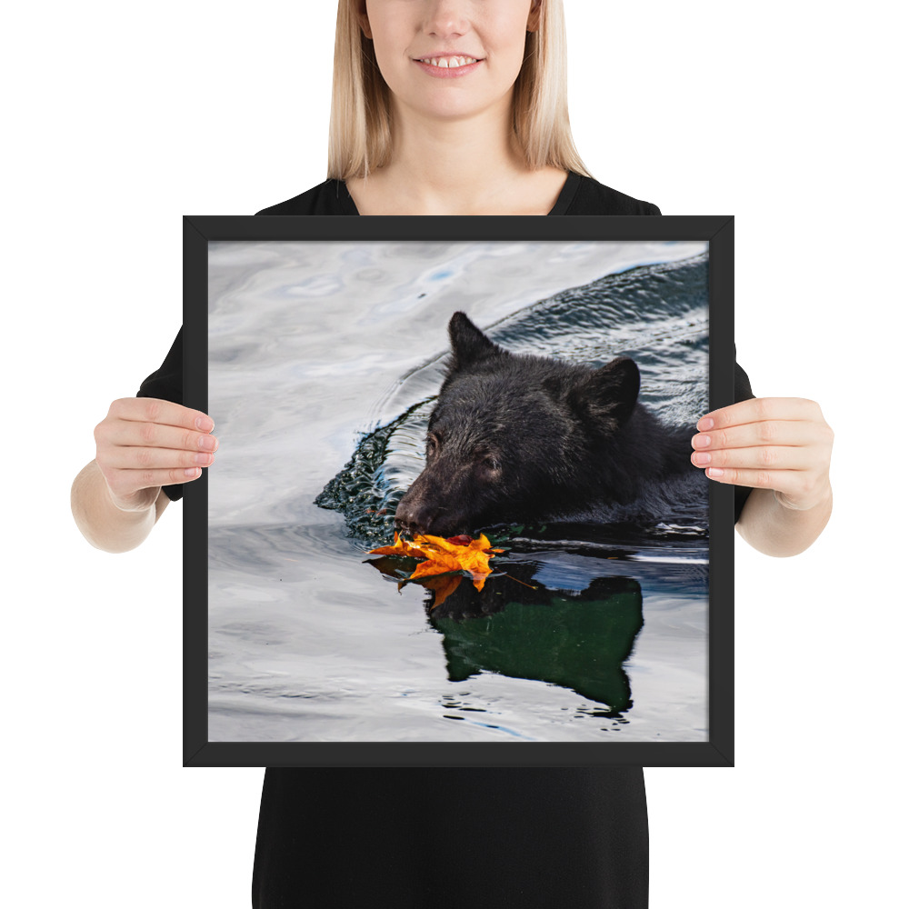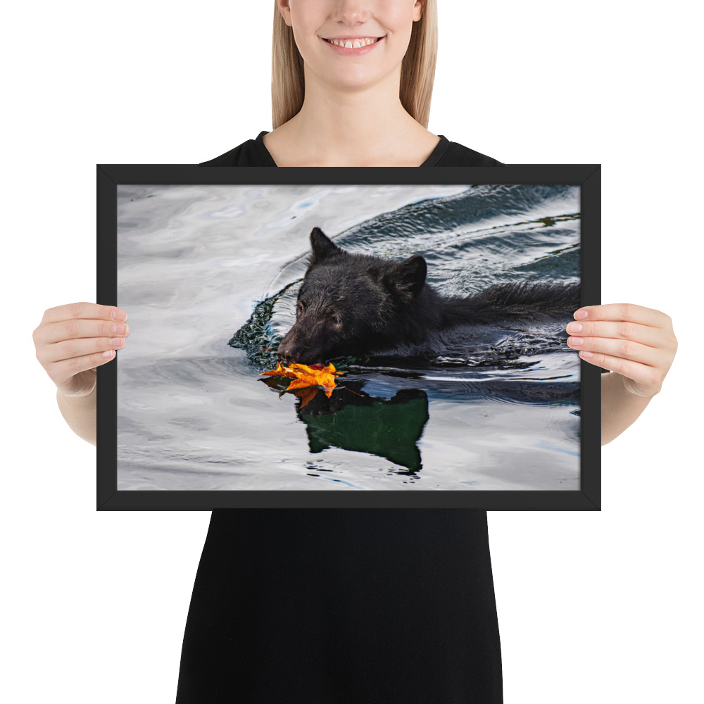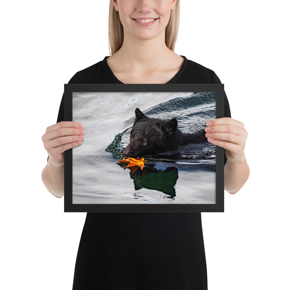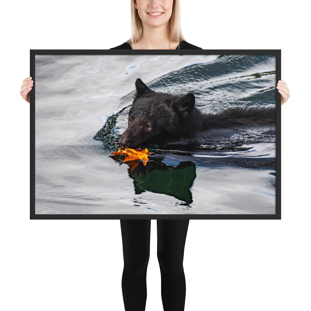 A bear swimming across the Port Alberni Inlet in the early days of Autumn just as the leaves start to change colour and fall.