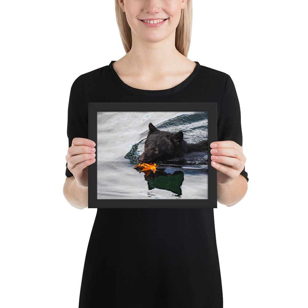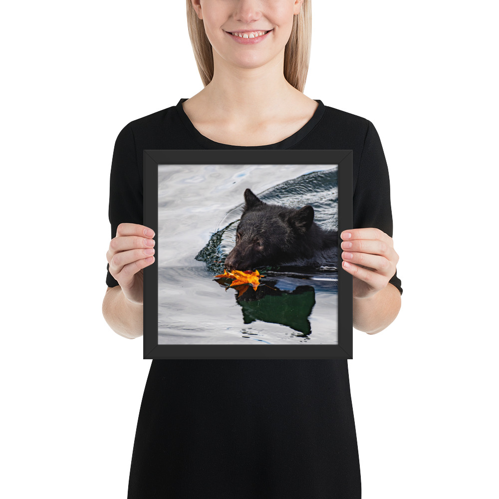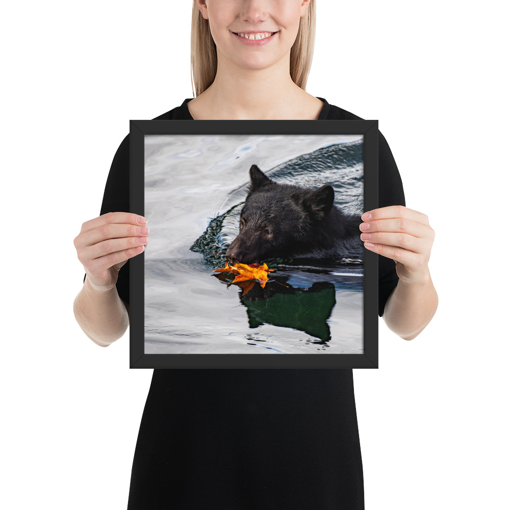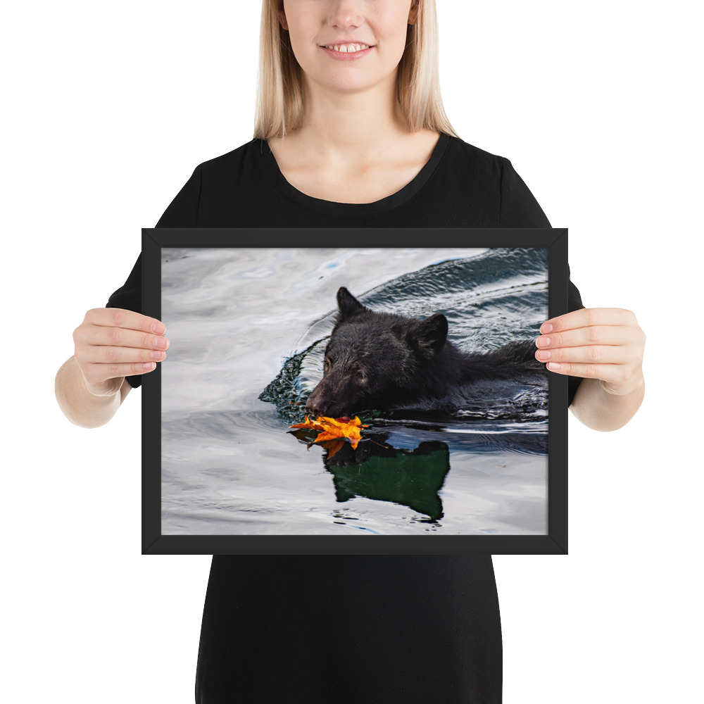 A bear swimming across the Port Alberni Inlet in the early days of Autumn just as the leaves start to change colour and fall.